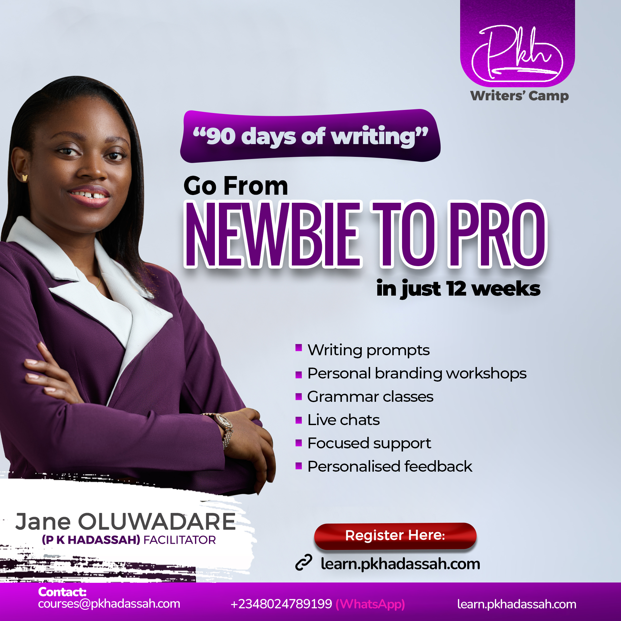 Become a skilled, prolific writer in just twelve weeks. PKH Writers’ Camp is the beginner’s ultimate guide to growing your career and personal brand using your writing skills. You will learn how to use your writing to show off your skills, competence and capacity in the spaces that matter